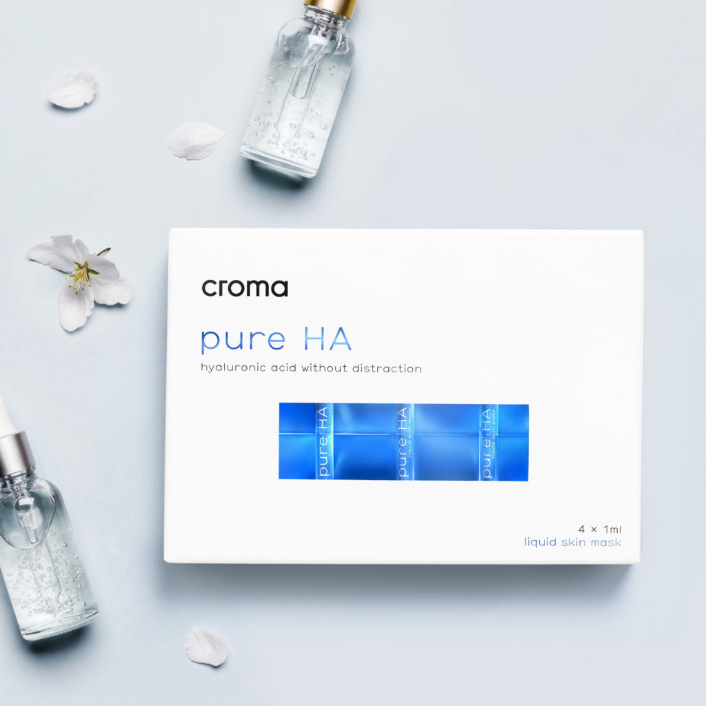 Let us introduce you to CROMA's latest innovation: pure HA, a highly concentrated liquid skin mask with 1.8% hyaluronic acid that softens, moisturizes and revitalizes your skin while increasing its natural moisture levels. With its silky, light texture, suitable for all skin types, the pure HA liquid face mask is the ideal complement to your skincare routine, essential for its moisturizing and softening formula that improves the skin's barrier and elasticity.